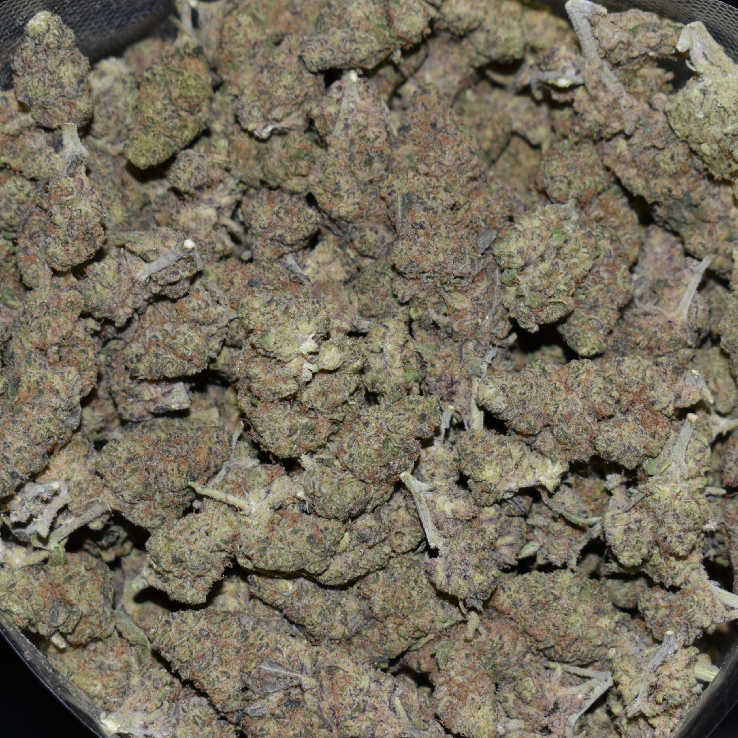 Dense, conical buds with lime-to-forest green tones, violet sugar-leaf flashes, and heavy trichome frost. Copper-orange pistils weave throughout, giving the nugs a “sugared” dessert look.
